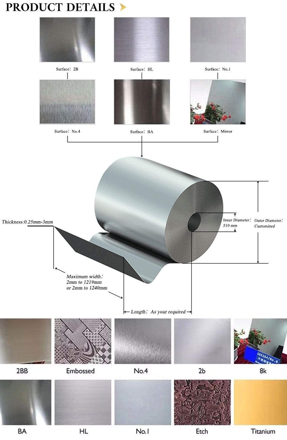 2B,2D, BA, NO.1, NO.4, NO.8, checkered, embossed, hair line, sand blast, brush, etching, etc.